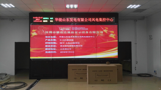 山東某風(fēng)電集控中心_3×4液晶拼接大屏_55寸液晶拼接屏 山東某風(fēng)電集控中心采用了雅迅達(dá)3×4拼接的55寸液晶拼接屏,同時(shí)使用了雅迅達(dá)定...