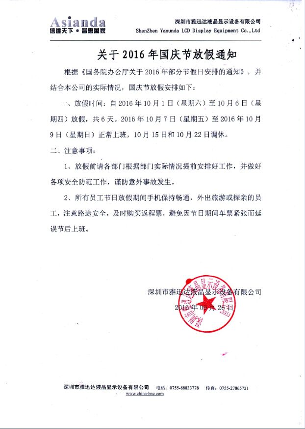 深圳市雅迅達(dá)液晶顯示設(shè)備有限公司2016年國慶節(jié)放假通知