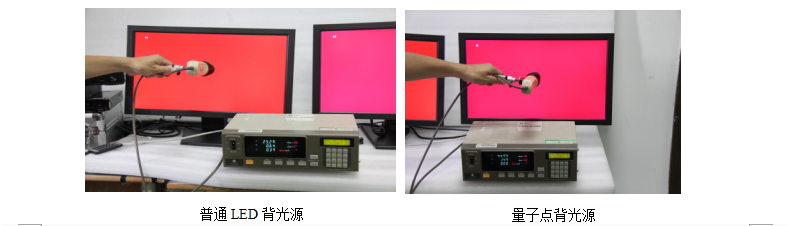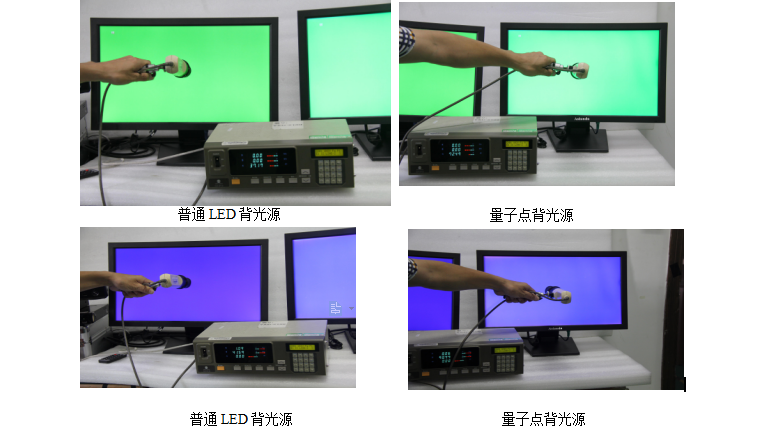 表測量 RGB 值。其他設置如下:對比度設置為 50;色溫設置在標準色溫模式;然后我們再準備一臺 不是量子點背光源的顯示器接上同樣的信號源,設置一樣。下面是現(xiàn)場測試照片對比