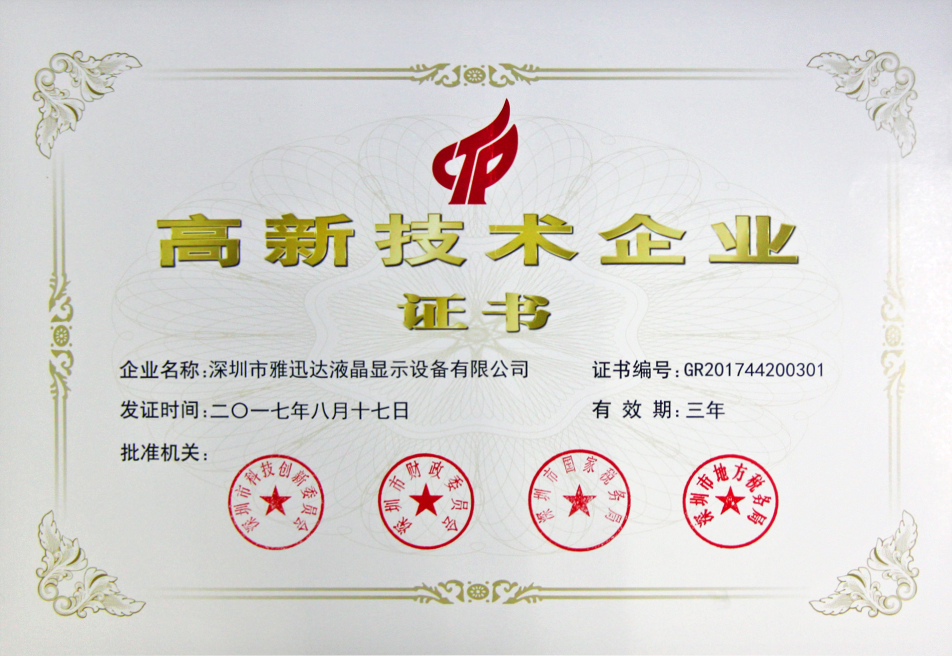雅迅達又再度迎來好消息!深圳雅迅達液晶顯示有限公司通過國家認證的高新技術企業(yè)認證書,科學是發(fā)展的重要內在推動力,高新技術企業(yè)是指在《國家重點支持的高新技術領域》內,持續(xù)進行研究開發(fā)與技術成果轉化,形成企業(yè)核心自主知識產(chǎn)權,并以此為基礎開展經(jīng)營活動,在中國境內(不包括港、澳、臺地區(qū))注冊一年以上的居民企業(yè)。它是知識密集、技術密集的經(jīng)濟實體。