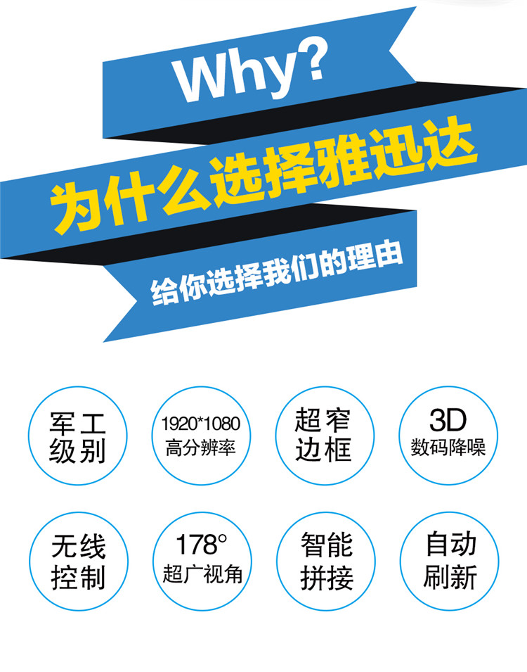 雅迅達(dá)一直秉承著“信達(dá)天下、普惠萬家”為企業(yè)口號(hào),秉承“專業(yè)、專注、專一”的企業(yè)精神和“典雅、守信、惜時(shí)、抗挫、精業(yè)”的企業(yè)意志,堅(jiān)持“4C服務(wù)、合作共贏”為原則,做出用戶體驗(yàn)更好 性價(jià)比更佳的 液晶拼接產(chǎn)品,如需了解更多詳情請(qǐng)點(diǎn)擊深圳市雅迅達(dá)液晶顯示設(shè)備有限公司