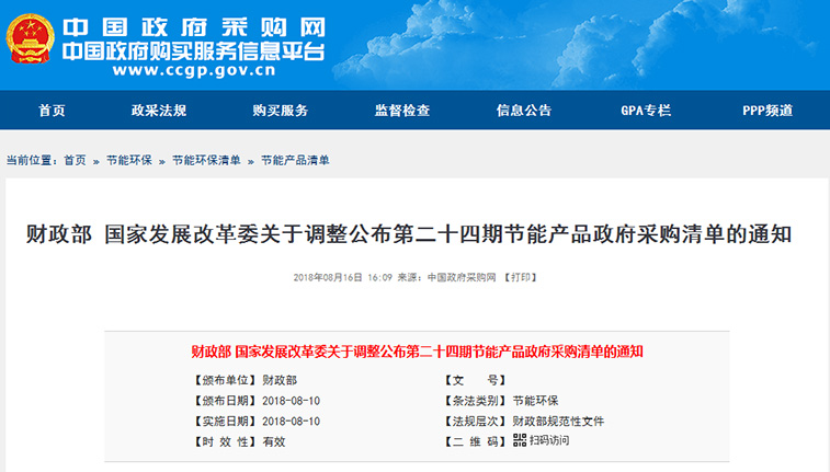 2018年08月16日 ,為推進(jìn)和規(guī)范節(jié)能產(chǎn)品政府采購,中國政府采購網(wǎng)發(fā)布了,財(cái)政部 國家發(fā)展改革委關(guān)于調(diào)整公布第二十四期節(jié)能產(chǎn)品政府采購清單的通知。