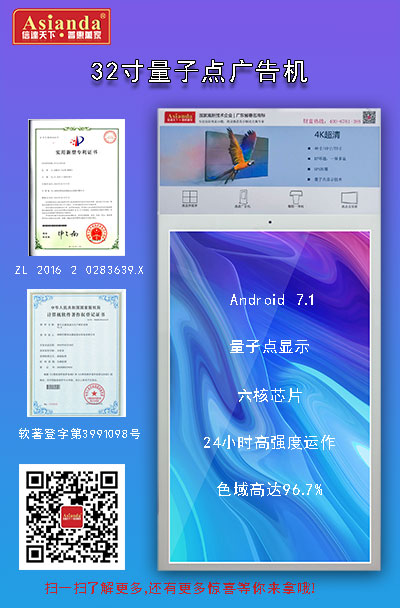 為了布局量子點產(chǎn)品系列,雅迅達申請了量子點液晶顯示生產(chǎn)研發(fā)系統(tǒng)V1.0著作權(quán)和量子點熒光屏專利,32寸量子點廣告機采用的是量子點LED背光顯示屏,當色域為480ma時,為96.7%;600ma為92.4%,比傳統(tǒng)的液晶廣告機色彩還原提高了30%左右,以獲得更好的視覺效果,這往往也是很多客戶需要的,將來也將會是廣告機的發(fā)展方向。同時,量子點廣告機除了在視覺色彩有比較大的優(yōu)勢之外,日常的用戶需求功能也是必不可少的,采用瑞芯微 RK3399 ,雙 核 Cortex-A72(大核)+四 核 Cortex-A53(小核)處理器, 4G 內(nèi)存,操作系統(tǒng) Android 7.1,支持USB、SD卡播放,支持滾動字幕,支持插播文件,支持斷電記憶,支持播放記錄,支持拷貝功能,支持分段輪詢播放,支持圖片+背景音樂播放,支持每周(7天)定時開關(guān)機,每天5段,支持文件列表播放,分屏播放,支持倒屏等熱門功能,為客戶提供更智能化的解決方案。