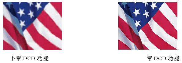 2) DCD邊緣平滑技術 DCD全稱為方向相關的去隔行,在動態(tài)畫面中可從任何角度成像,修補畫面邊緣,獲得更光滑、更自然的視頻圖象效果。如下圖,DCD可以去除邊緣的鋸齒現(xiàn)象。