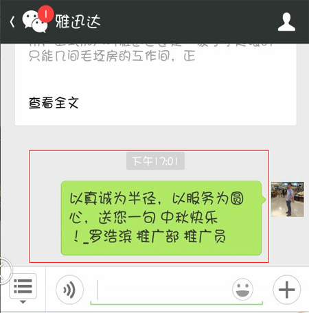 2、進入微信,點擊“訂閱號”,選擇“雅迅達”,選擇文字編輯“祝福語+姓名+區(qū)域+職務(wù)”并發(fā)送。如下圖: