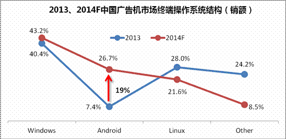 得益于安卓系統(tǒng)在移動市場的統(tǒng)治地位日趨穩(wěn)定,開發(fā)者眾多,驅(qū)動開發(fā)不斷網(wǎng)完善,一般的高清、交互均可實現(xiàn),穩(wěn)定性也得到加大改善。而且無需授權(quán)費,可令企業(yè)節(jié)省大量成本,價格更具競爭力。但未來系統(tǒng)高版本如何收費,讓安卓市場的前景存在一定不確定性。2014年,安卓系統(tǒng)廣告機的比重超過26%,市場比重大幅提升19%。