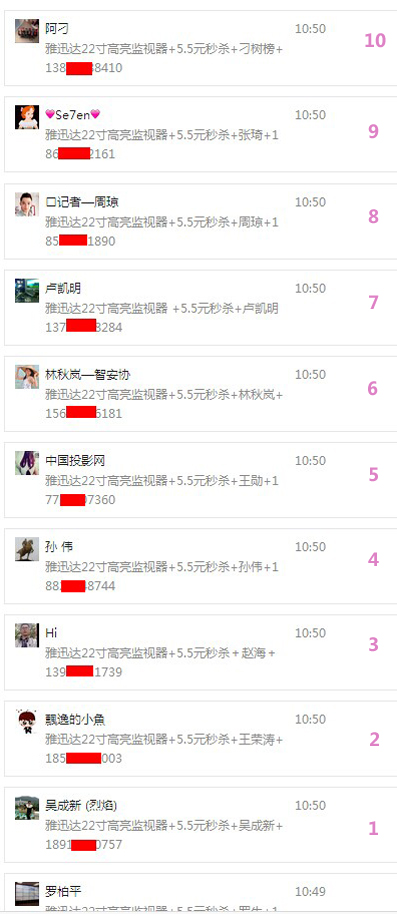 北京時間2015年5月5日10:50分,雅迅達(dá)2015新產(chǎn)品媒體發(fā)布會現(xiàn)場5.5元新產(chǎn)品微信秒殺活動順利舉行。首先感謝各位用戶的積極參與,活動中獎名單如下所示: